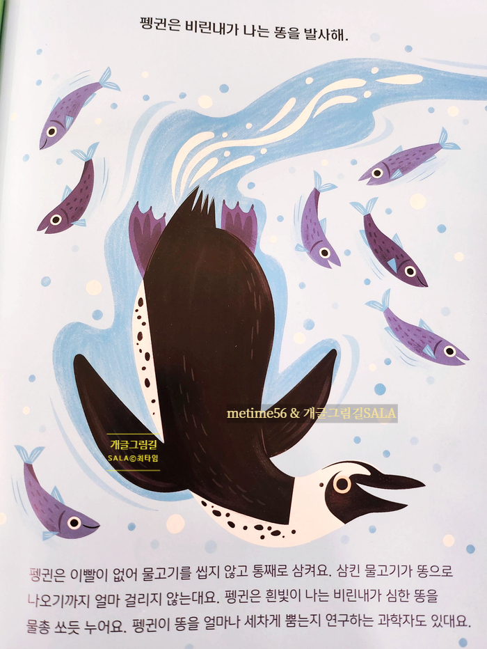얼핏 보면 ‘똥’이라는 단어가 들어가 있어 어린 유아들이 좋아할 것 같지만, 실제로는 7-9세 정도의 어린이들의 탐구심과 판단력을 키워주는 정보전달형 그림책이다. 책은 간단한 픽션 서사 하나 없이도 아이들이 흥미를 가질만한 질문과 재미난 설명들로 가득 차 있다.