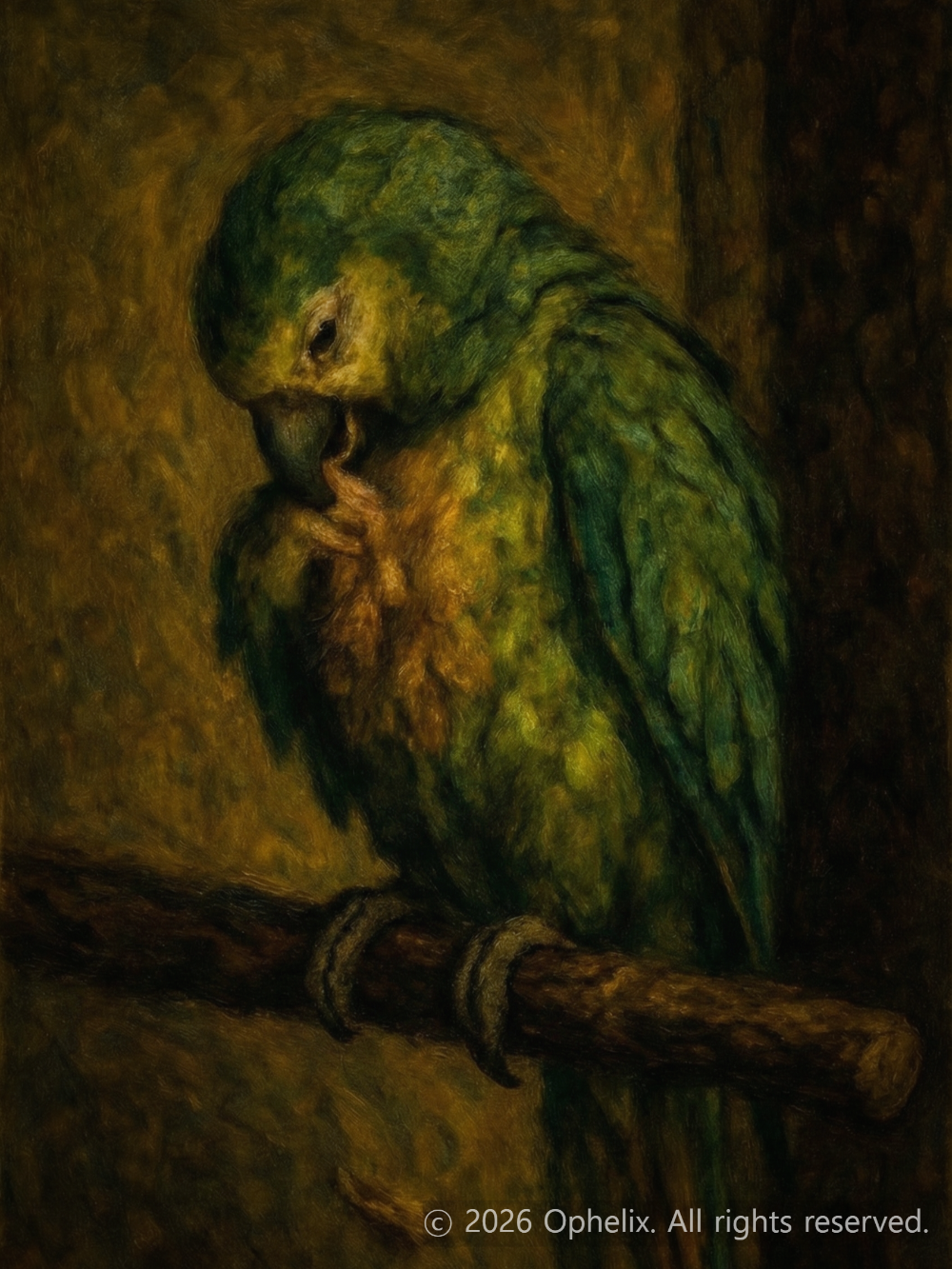 앵무새는 천적을 피하기 위해 아픈 것을 숨기는 본능이 있어, “가만히 있는 시간”이 길어도 겉으로 티가 덜 난다. 자해 행동이 겉으로 드러났을 때는 이미 내부적으로 극심한 스트레스가 누적된 상태일 확률이 높다.